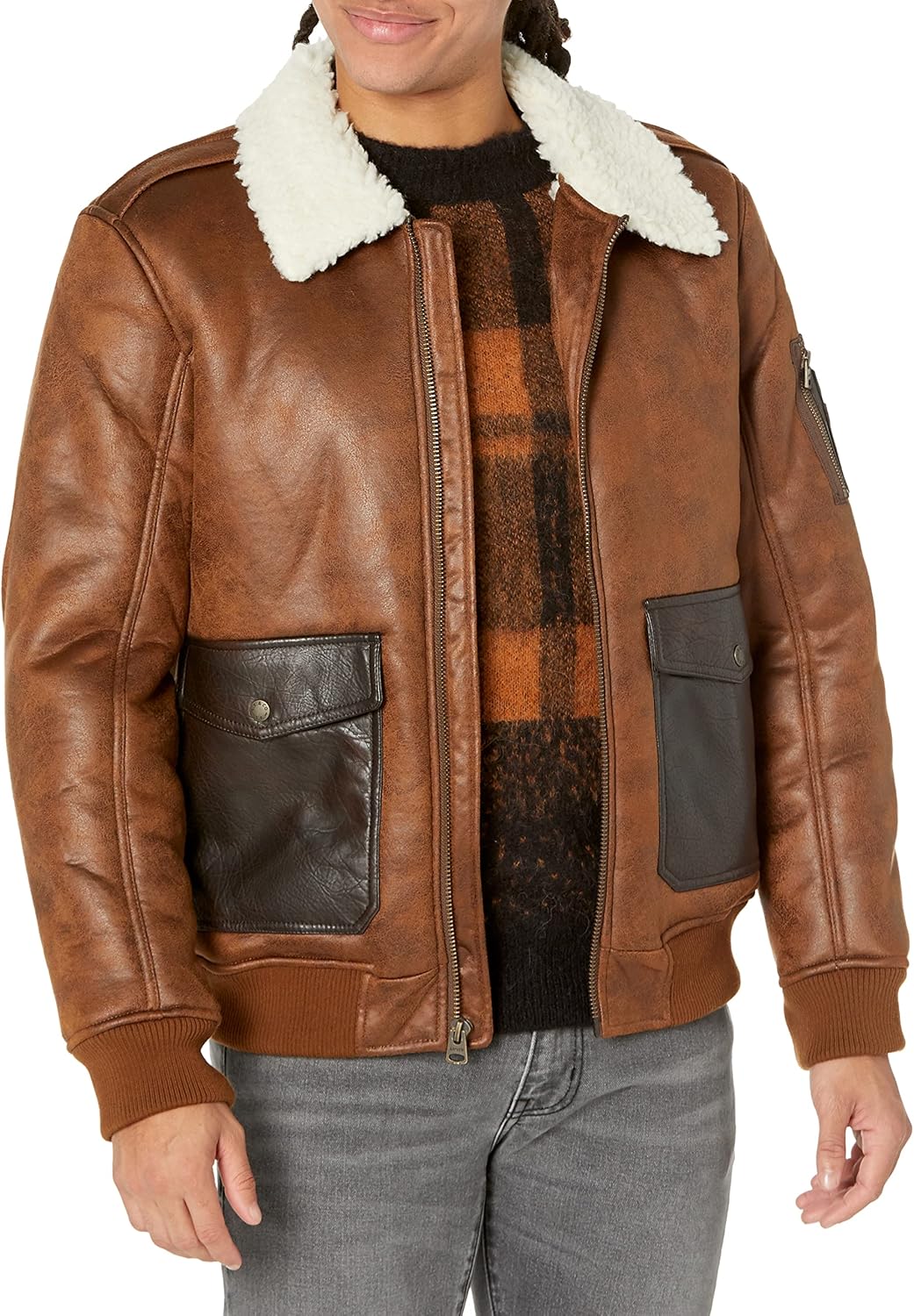 mens Faux Leather Aviator Bomber Jacket With Sherpa Lined Collar