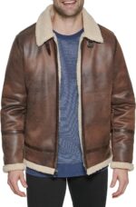 - Coat description: This faux leather bomber jacket-men; has a shearling lining and collar that makes this coat a classic mens fashion statement