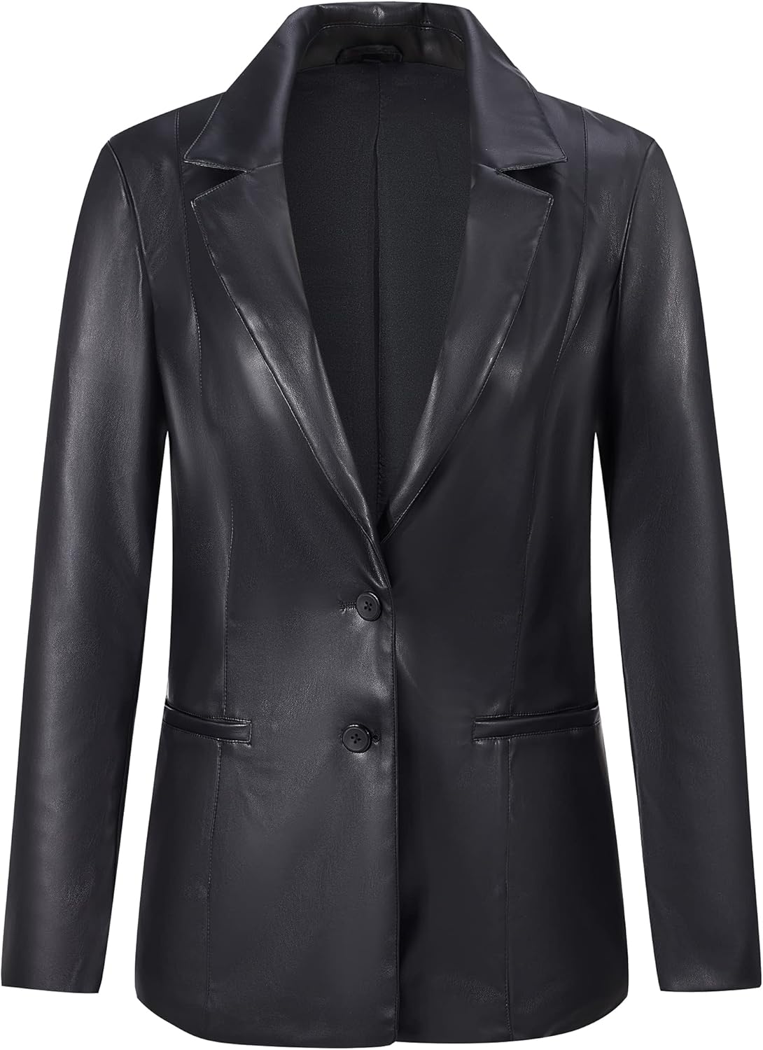 - Feature: The faux leather blazer women is designed with single breasted front 2 buttons closure, smooth soft and skin-friendly polyester lining, two pockets front(not fake,pre-stitched,the stitching thread can be removed), drop shoulder, long sleeves, cuffs with buttons, Classic solid color and collar. Notice your size in contrast with our size chart before purchase please.
