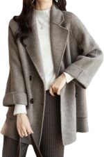 - 【SELLING POINTS for PEA COAT】—– Notched collar lapel wool blend coat/ Quarter sleeve with roll up cuffs/ Double breasted button down pea coat/ 2 Side pockets/ Tweed pea coat/ Mid long length/ Solid color wool coat- khaki, pink coat, blue jacket, camel coat women